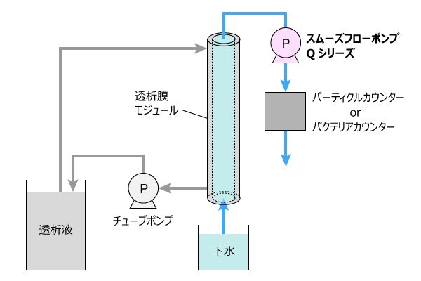 技術の有効性を評価するため、ろ過後の水をパーティクルカウンター(微粒子計測器)やバクテリアカウンタ―に移送して測定する。