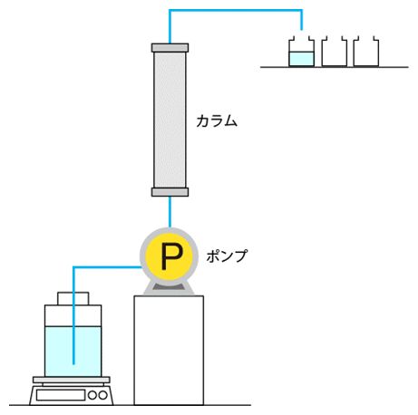 土壌のサンプルを充填したカラムに、微生物の餌となる栄養分が入った培養液をポンプで注入する。