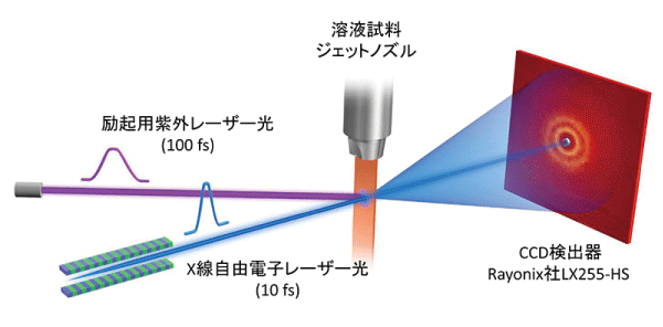 光触媒含有の有機溶媒をポンプで循環させ、ジェットノズルから噴射。そこに励起用の紫外線レーザー光と観測用のX線レーザー光を照射して、光化学反応における原子の動きを観測(X線時間分解測定)する。